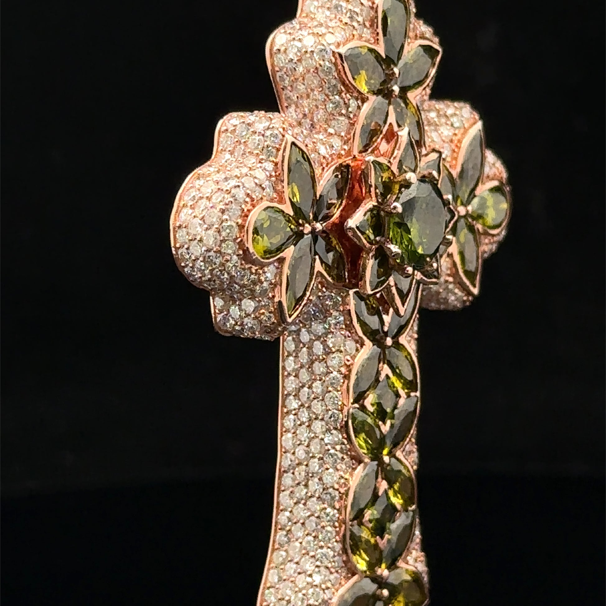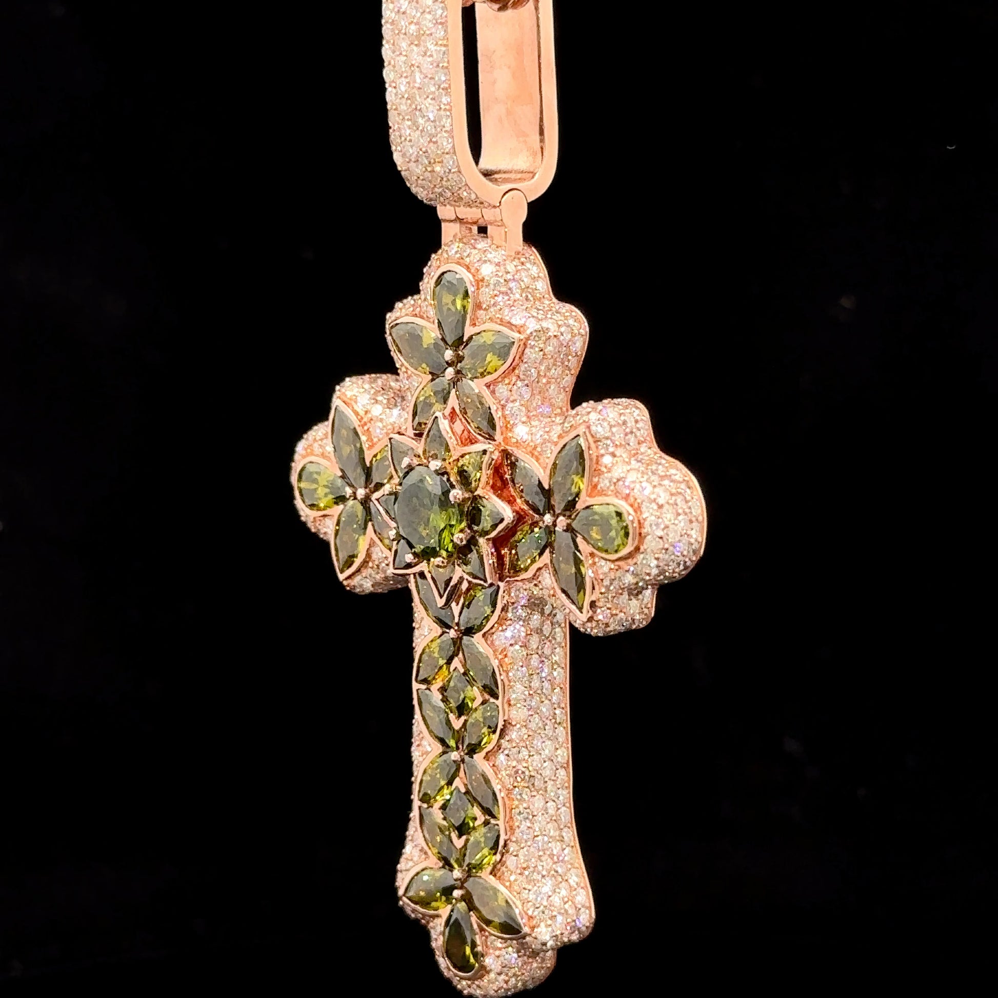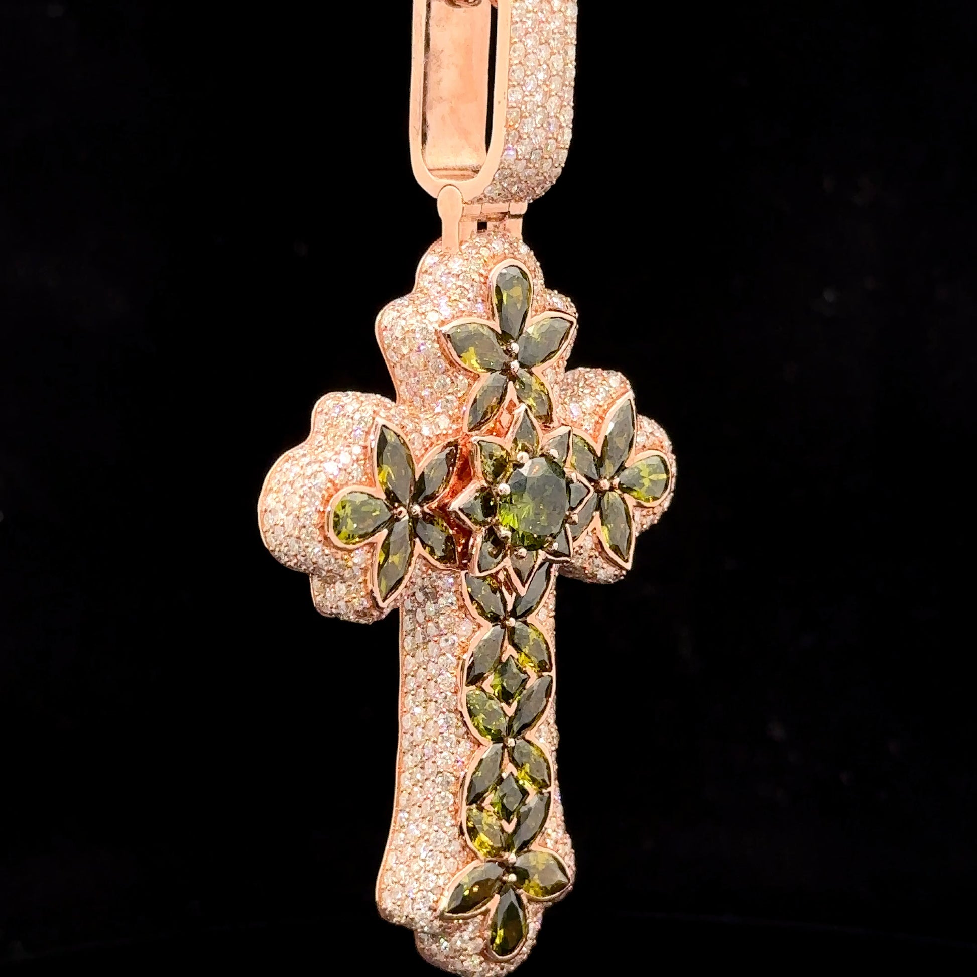 Rose gold and 7.55ct diamond Cross Pendant with round diamonds and green stones.