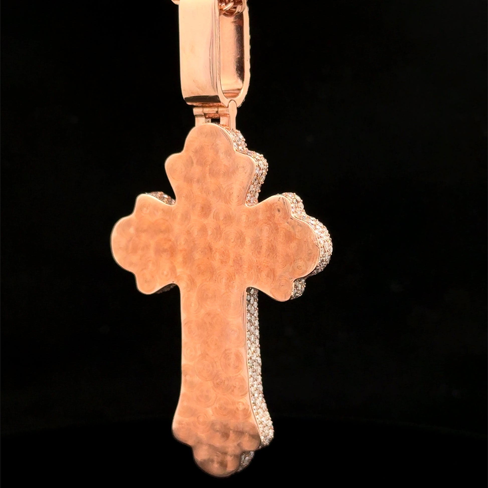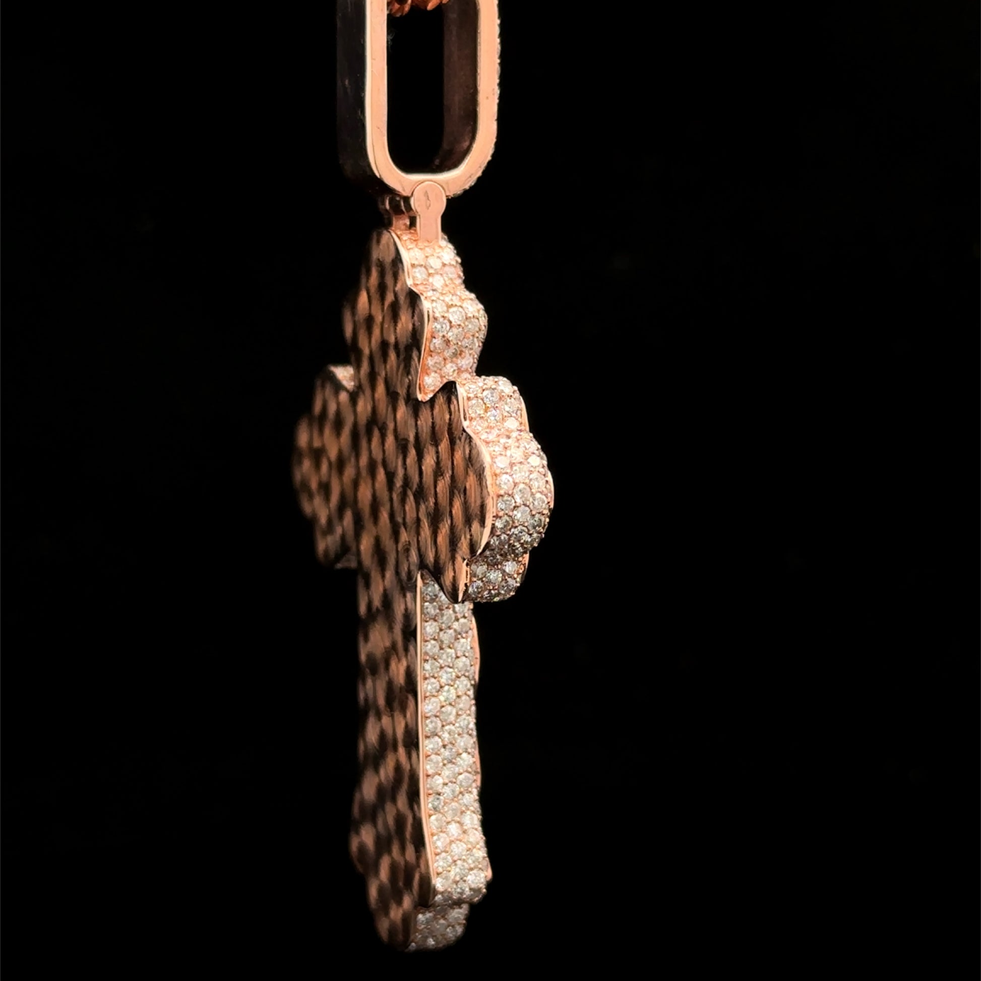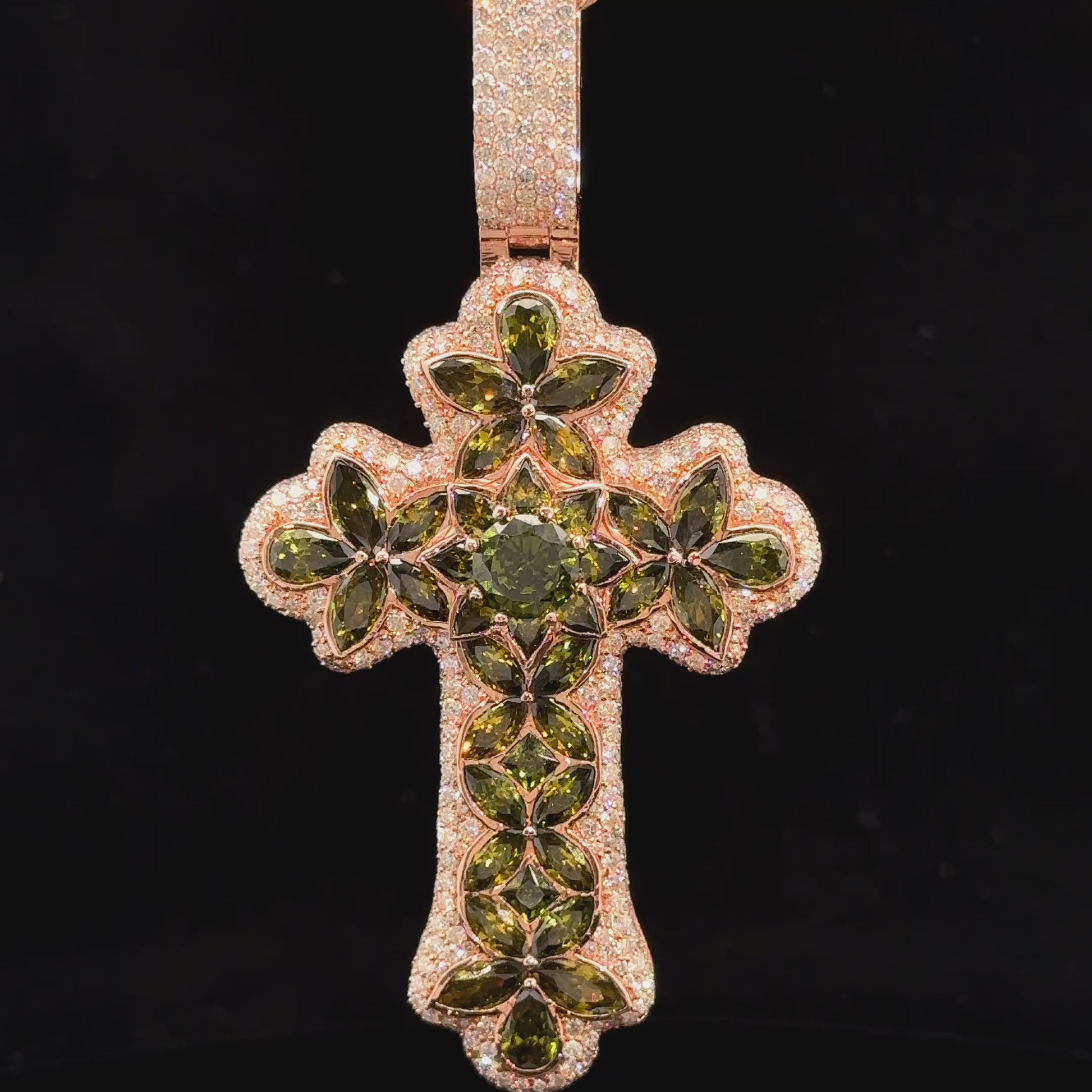 Rose gold and 7.55ct diamond Cross Pendant with round diamonds and green stones.
