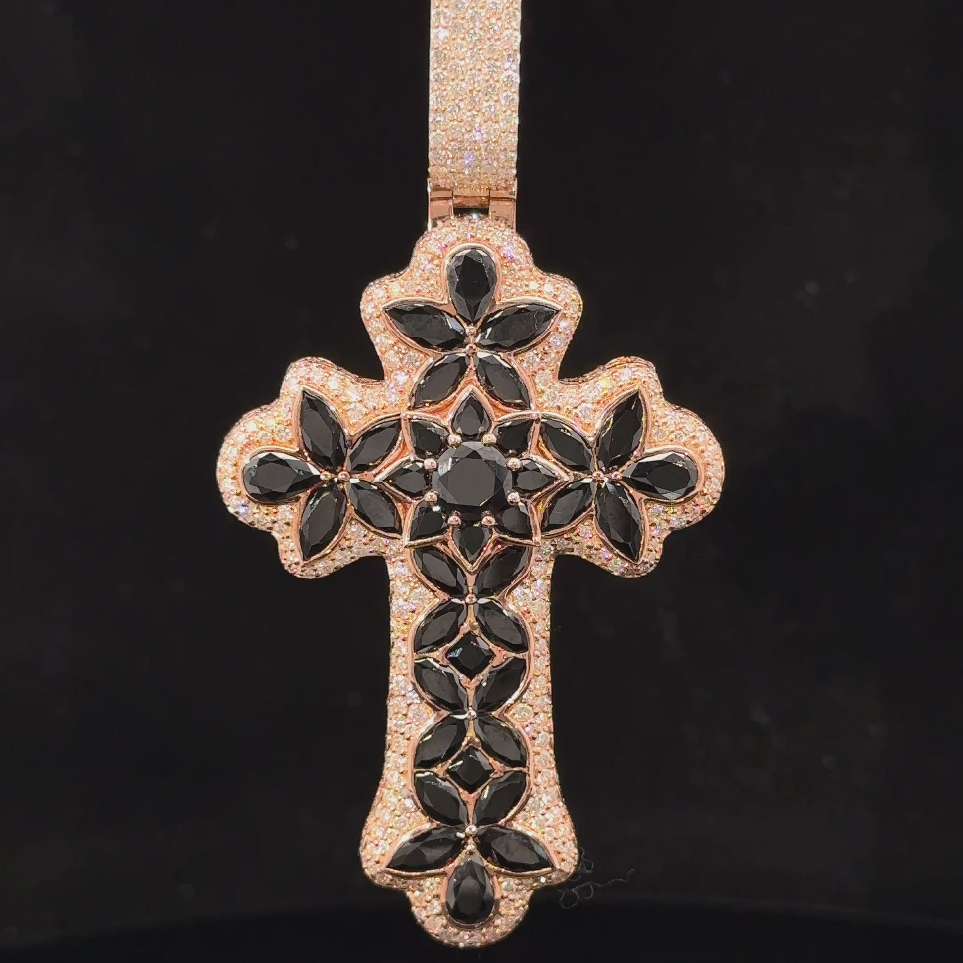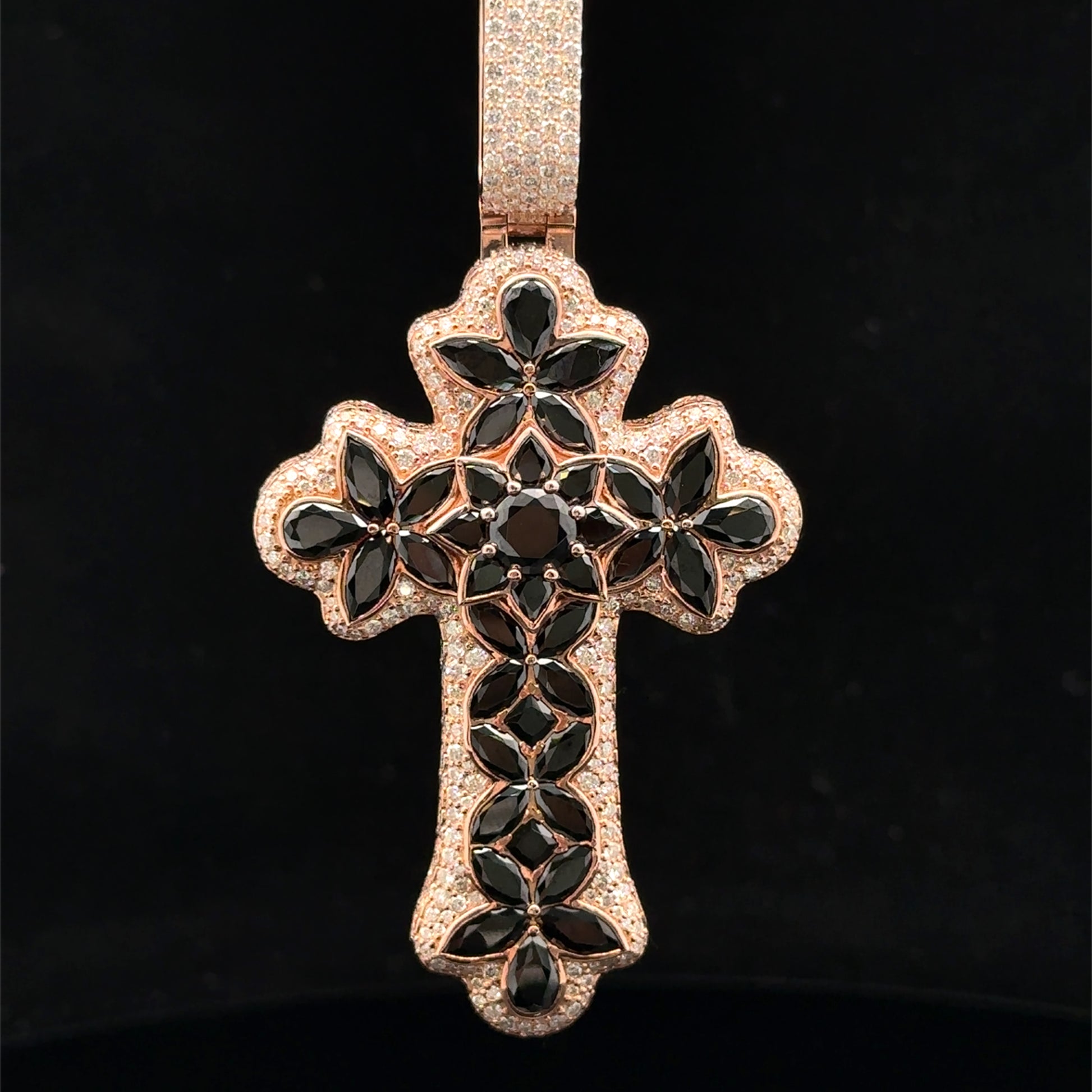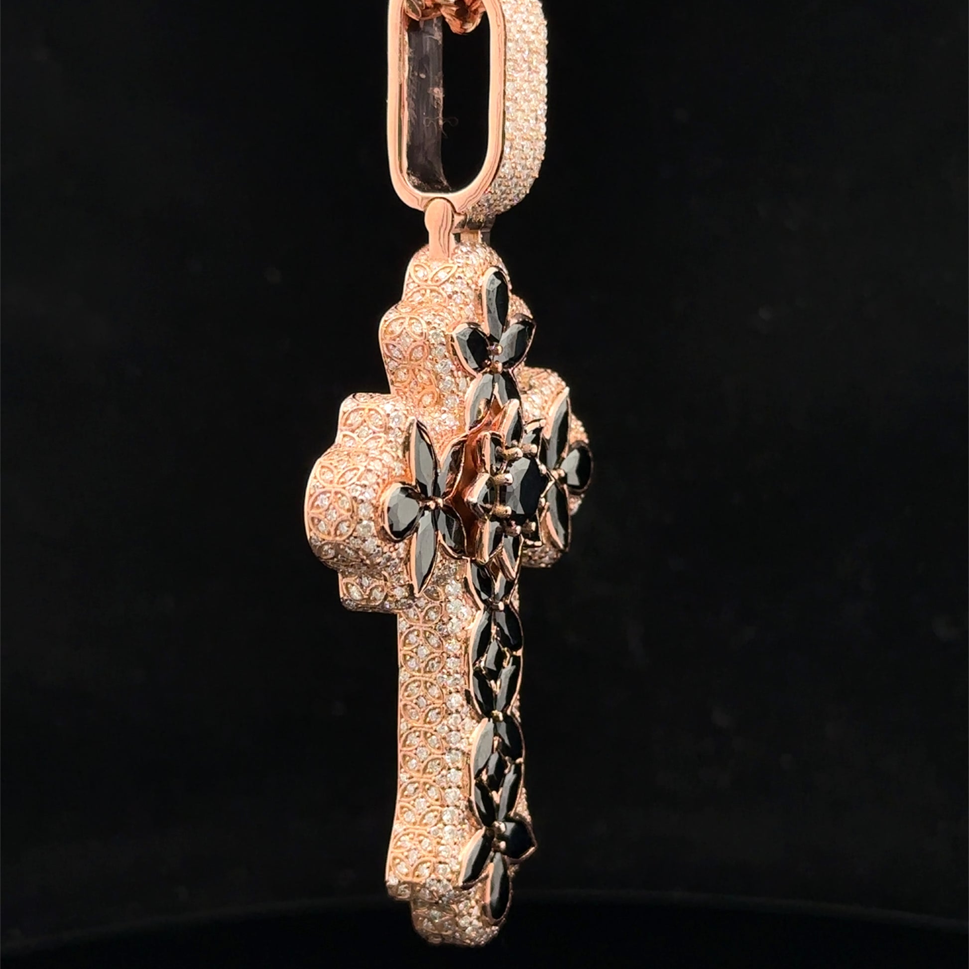 Rose gold and 5ct diamond Cross Pendant with round diamonds and black stones.