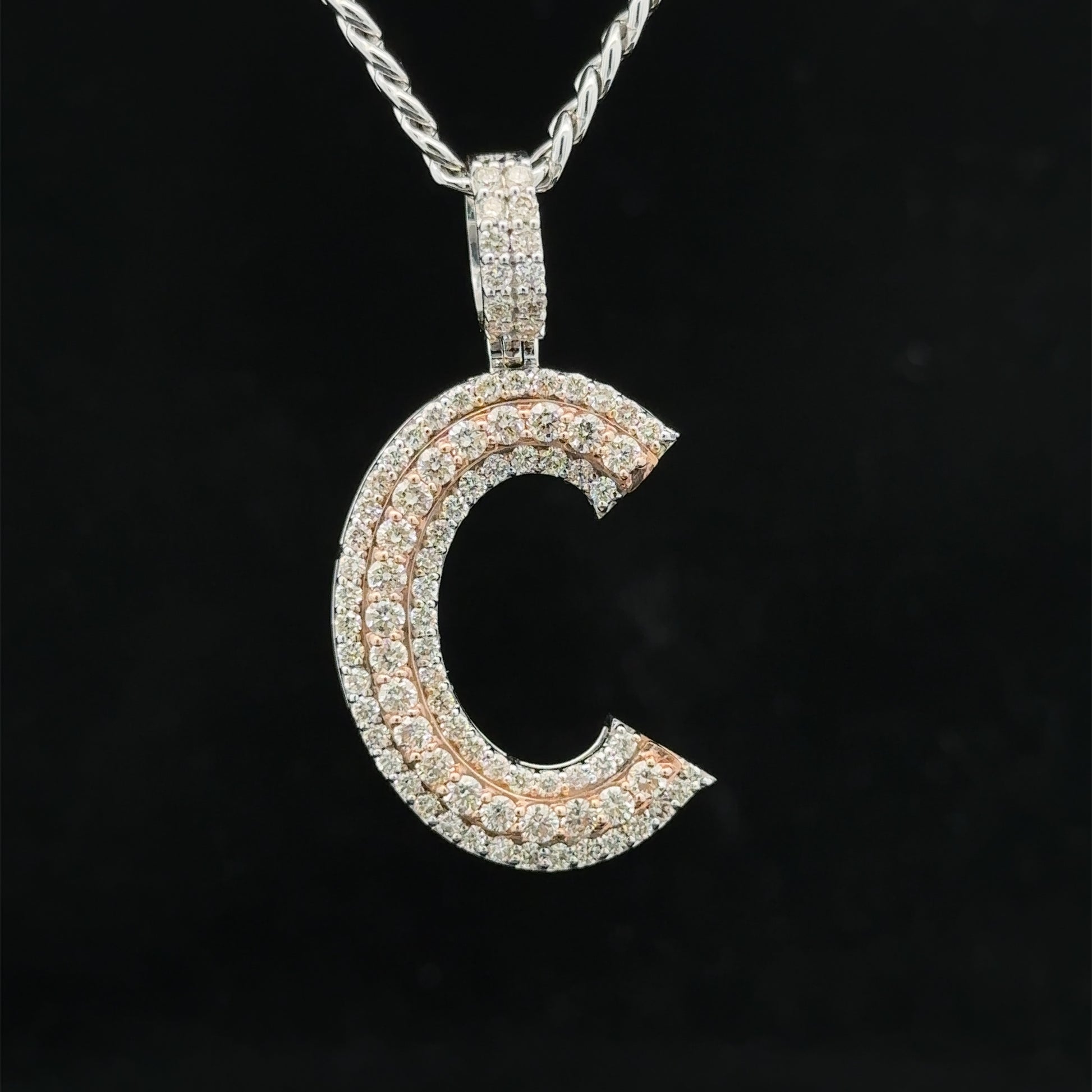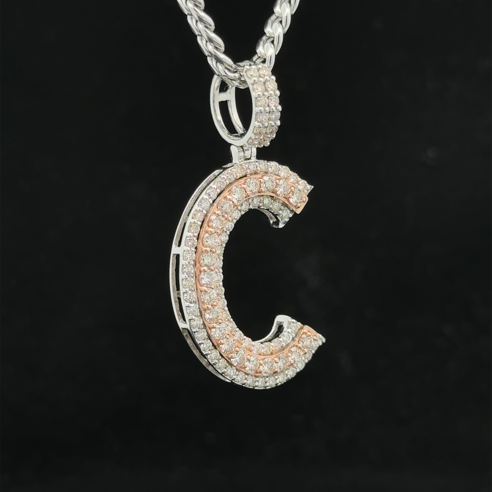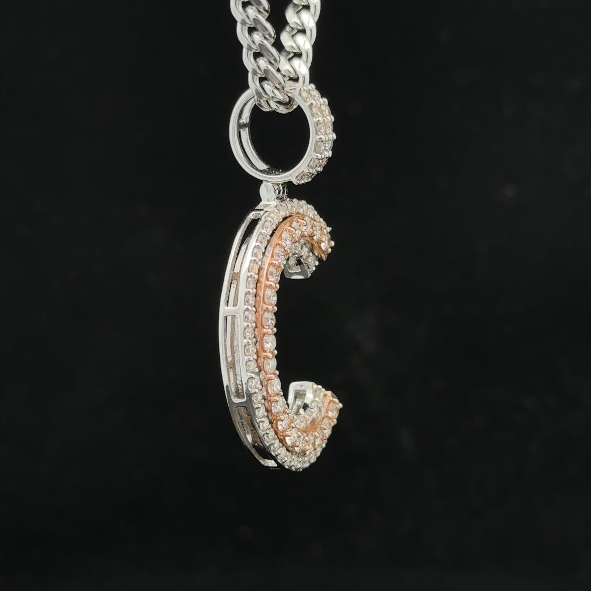 - Charm is 14k two-tone: rose and white gold and natural round diamonds.