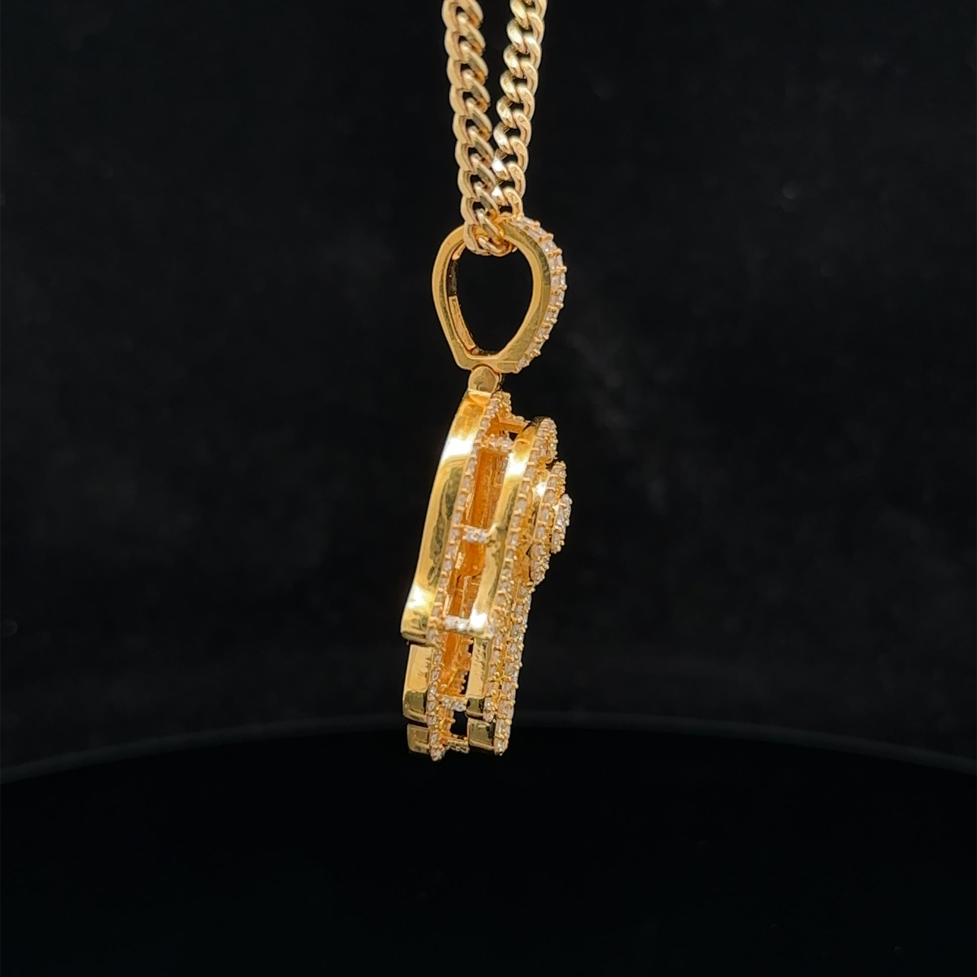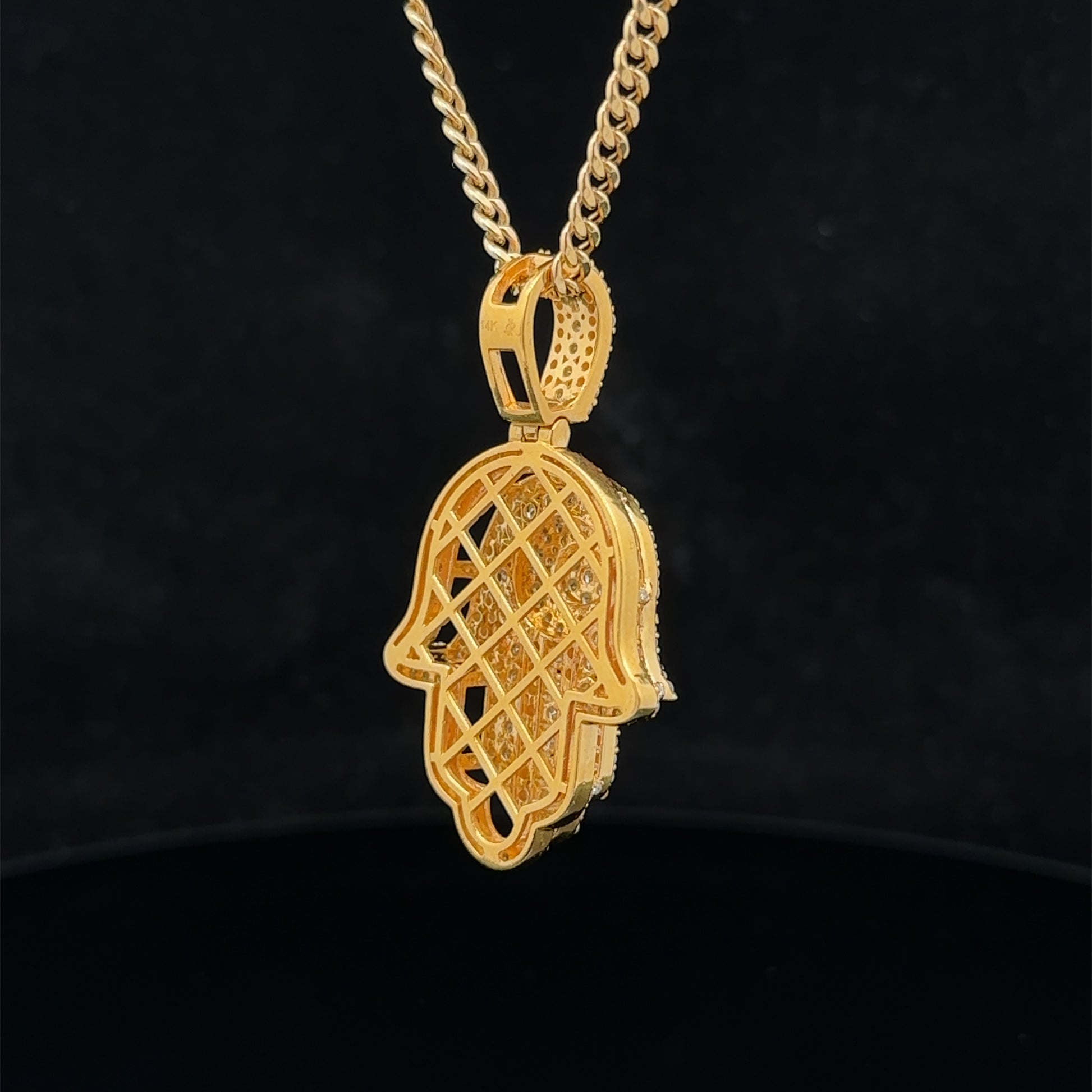 14k yellow gold and diamond Hamsa pendant and 14k yellow gold cuban link chain