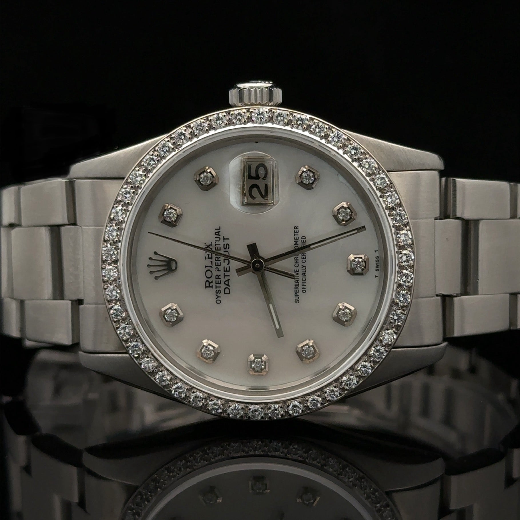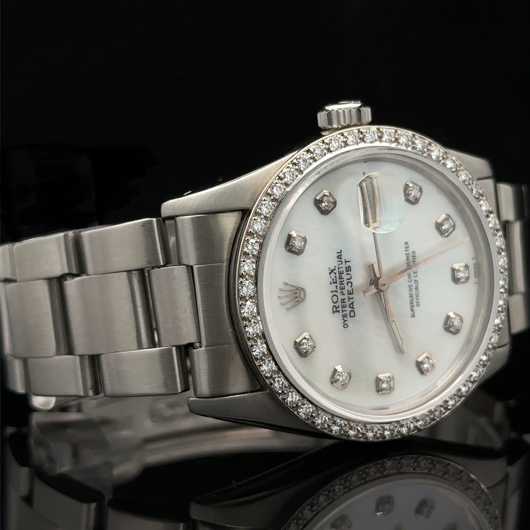 - Mother of pearl dial with diamonds.