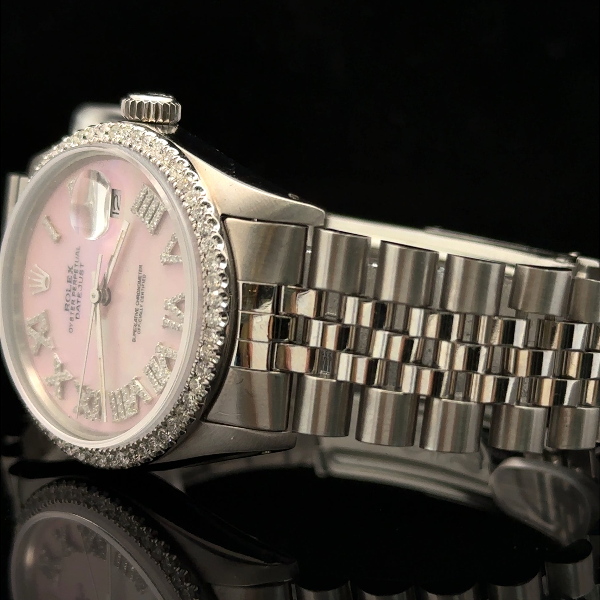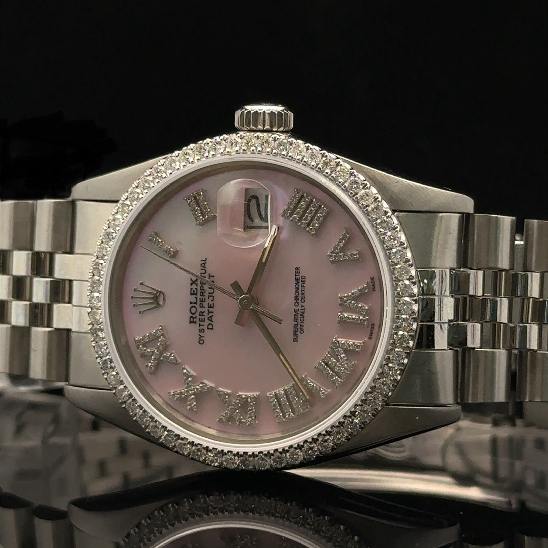 - Diamond pink dial with Roman numerals.