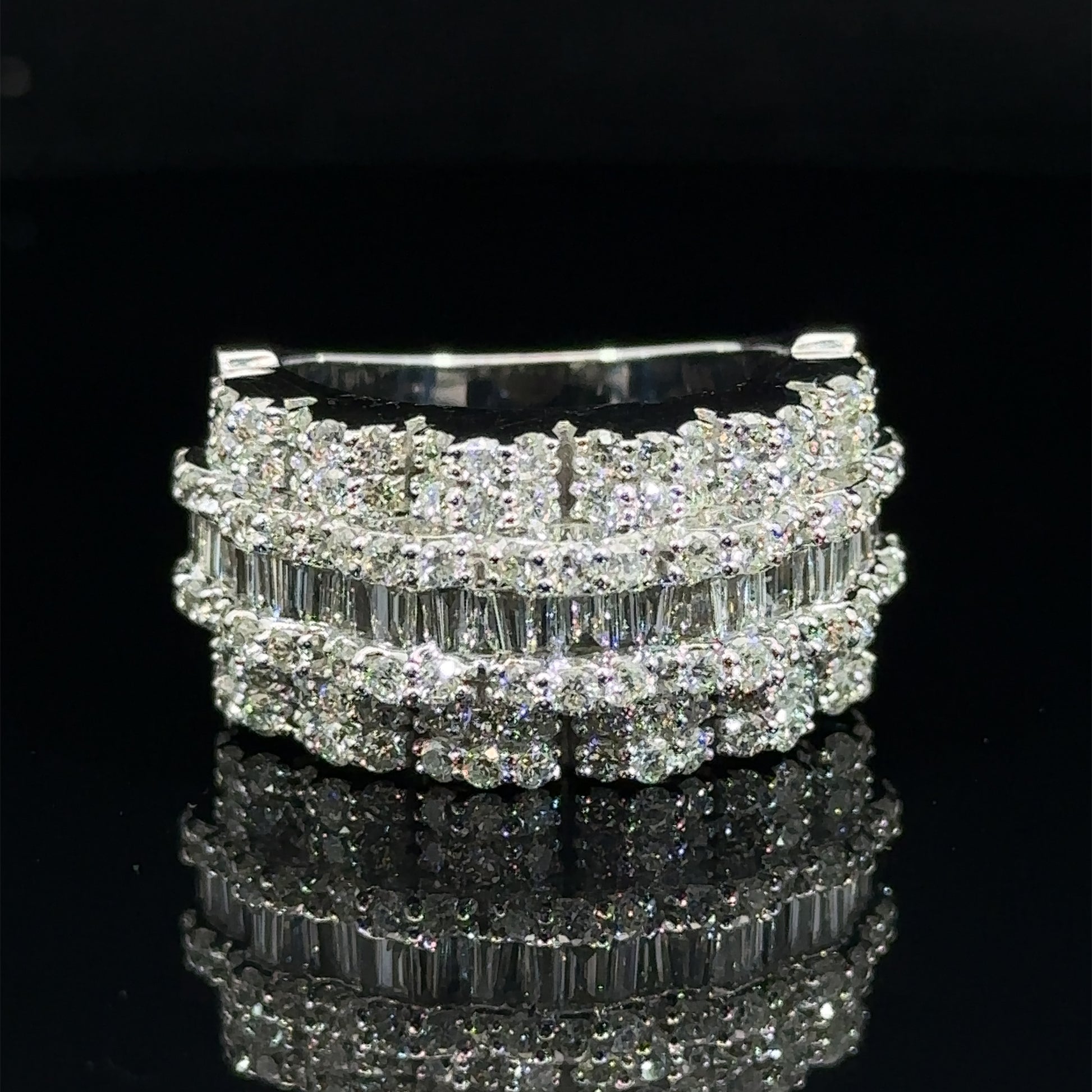 14k white gold and natural round and baguette diamond ring.