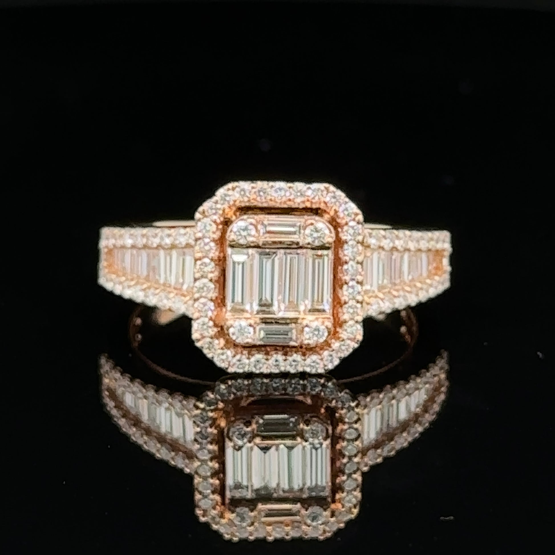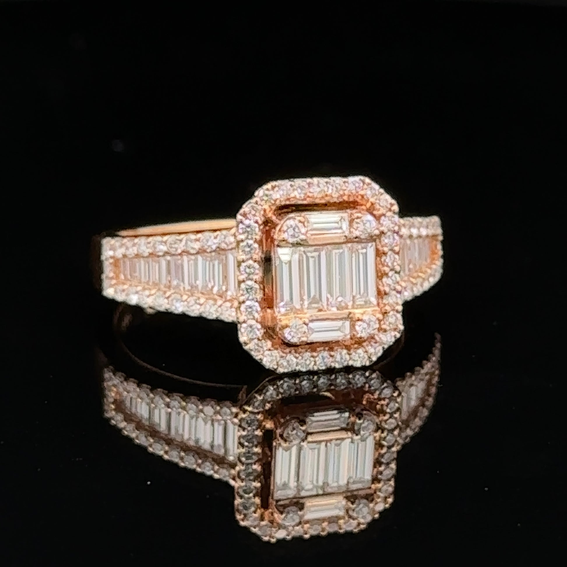18k rose gold and natural round, baguette diamond fancy ring.