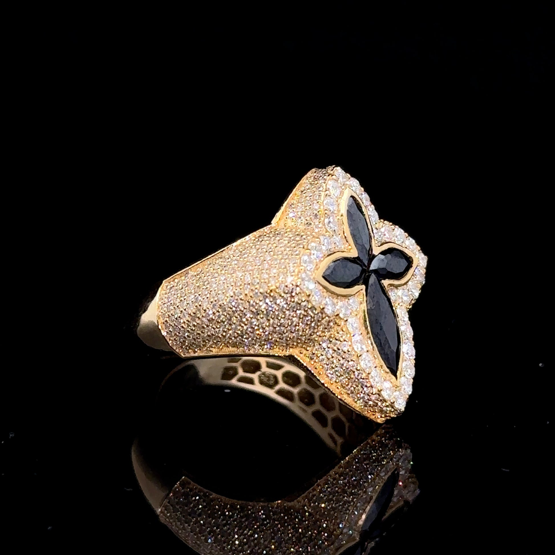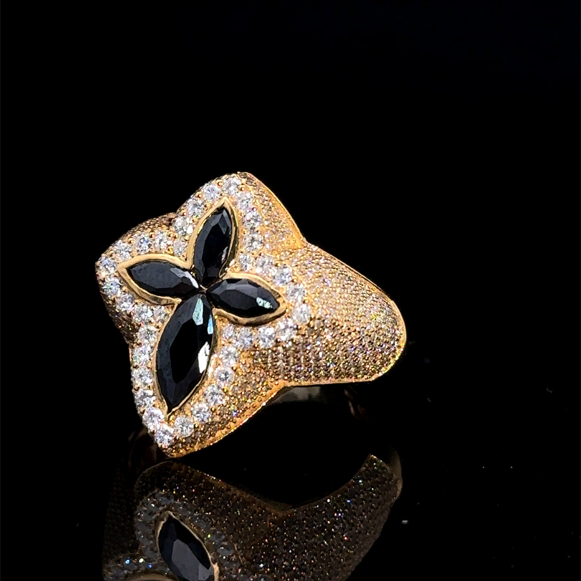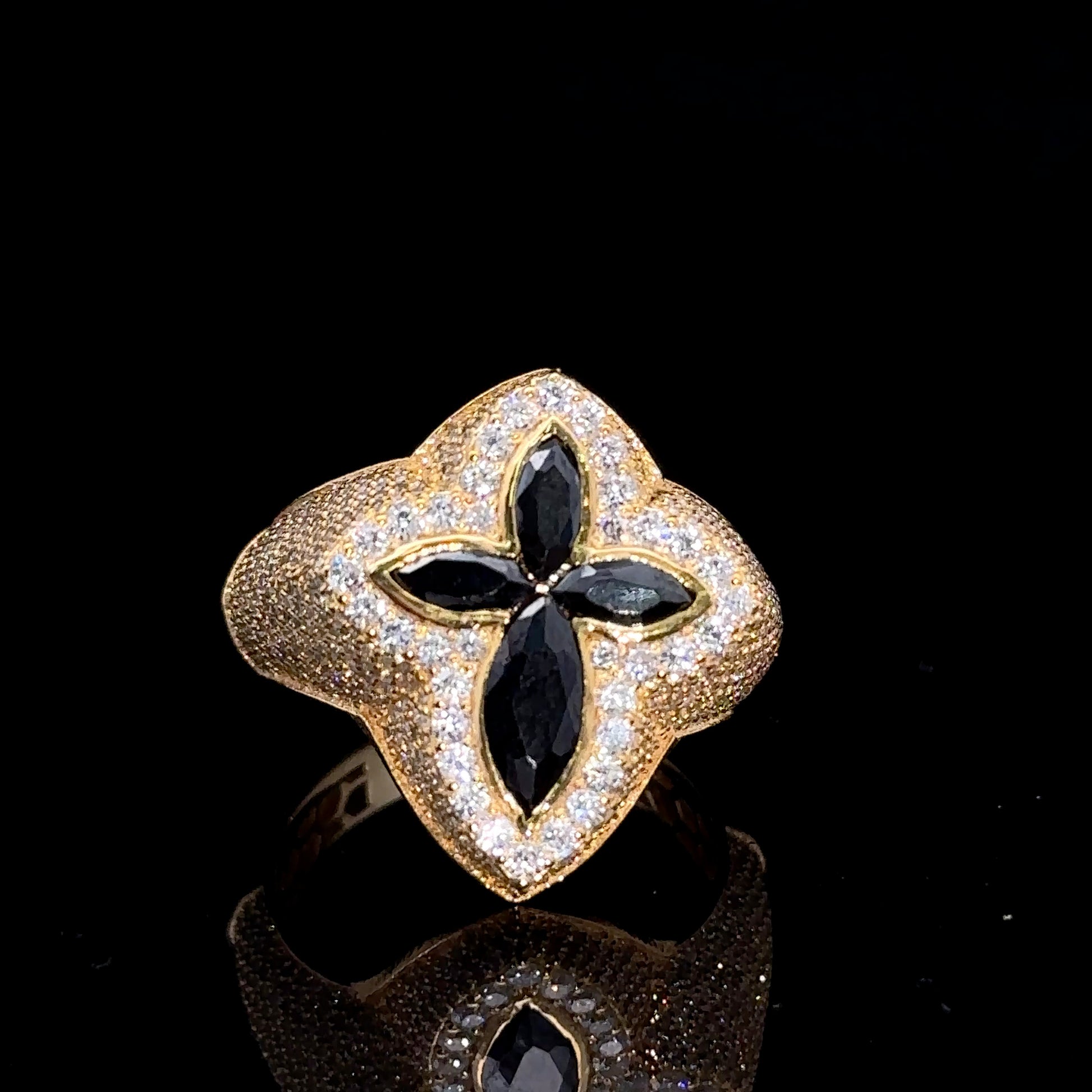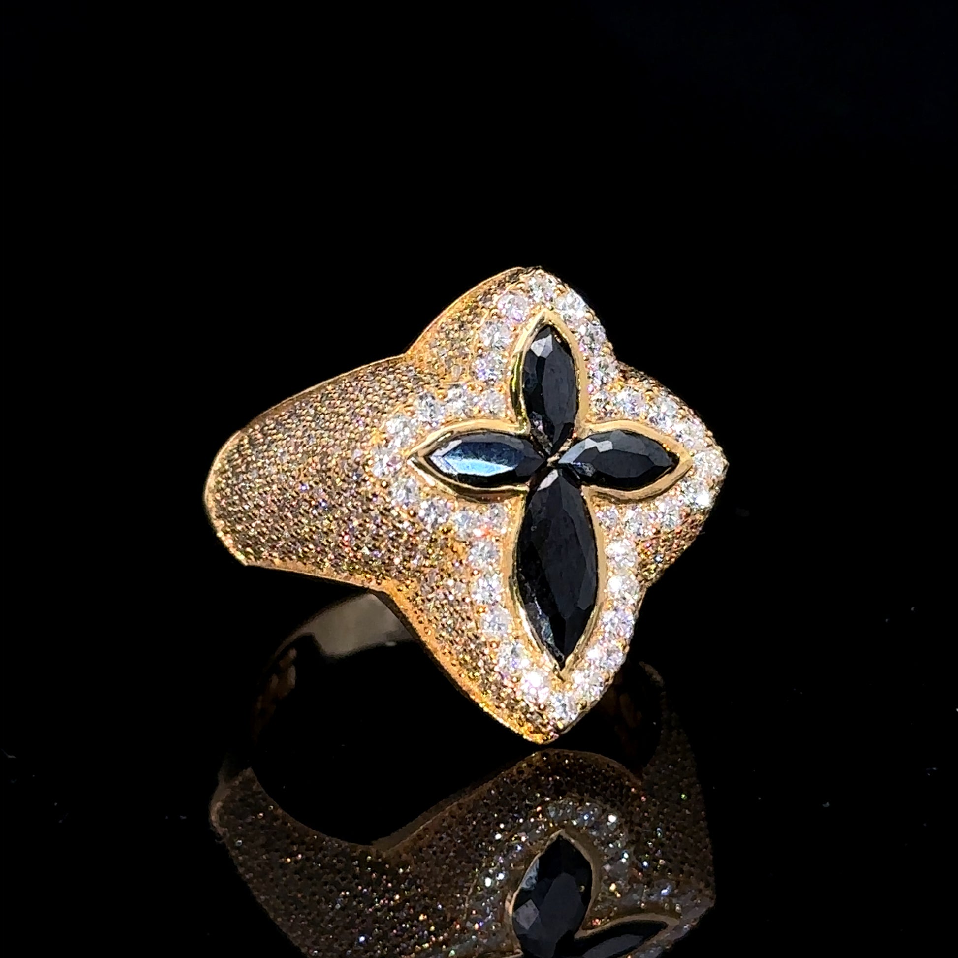 Yellow gold and diamond Cross Ring with Dark Fancy Pear Cut Gem Stones