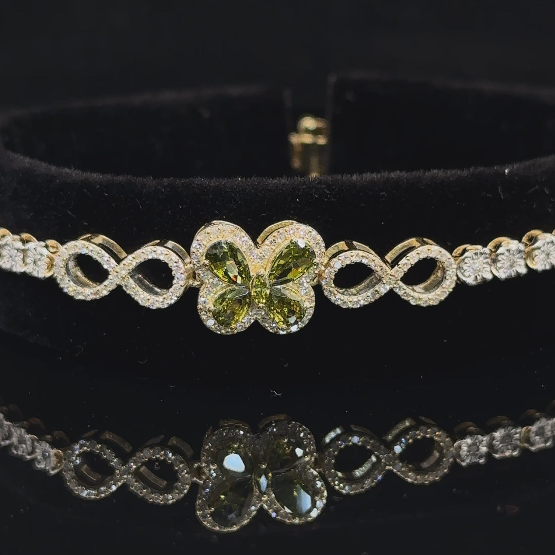 Yellow gold and Diamond Butterfly & Infinity bracelet with Multicolored Red Stones.