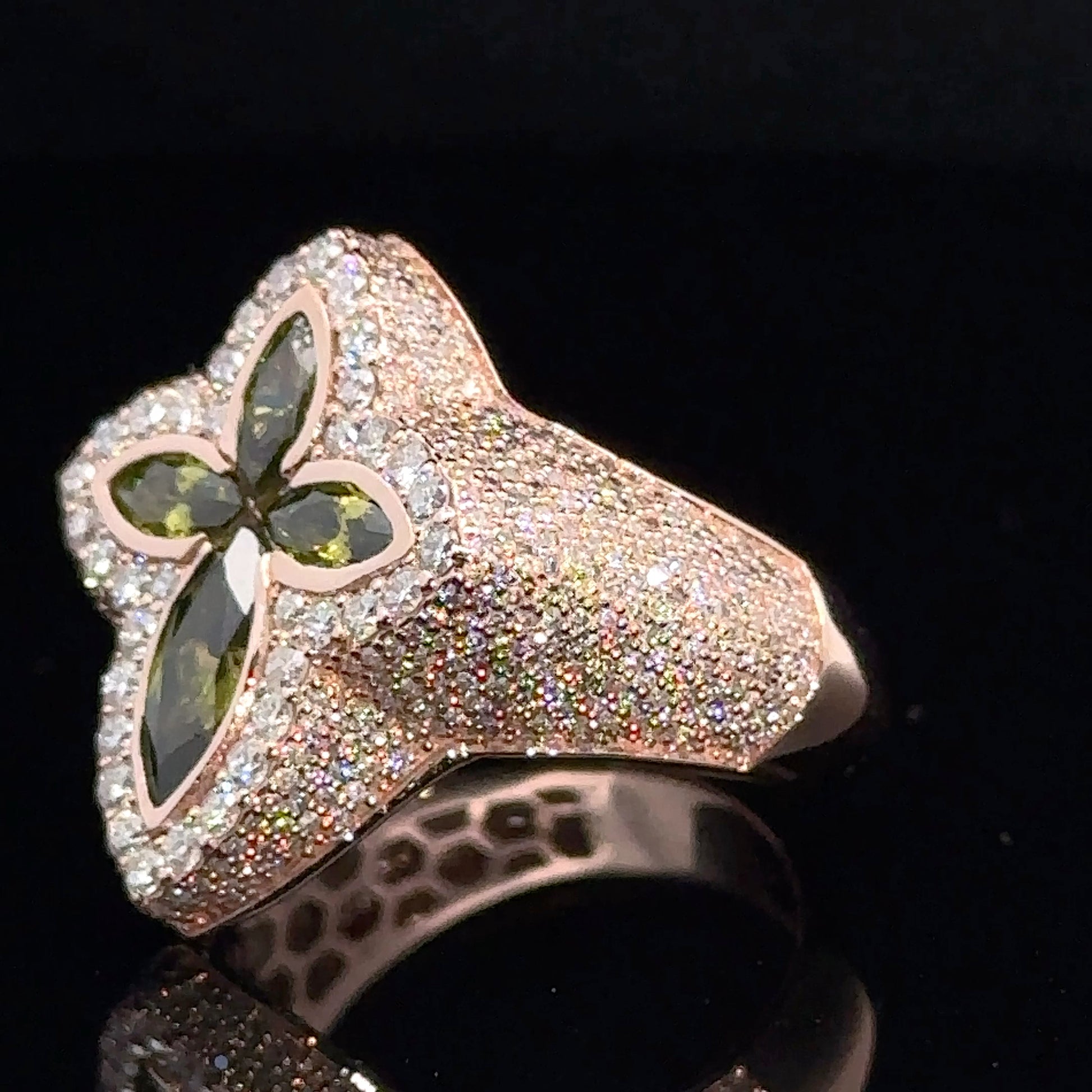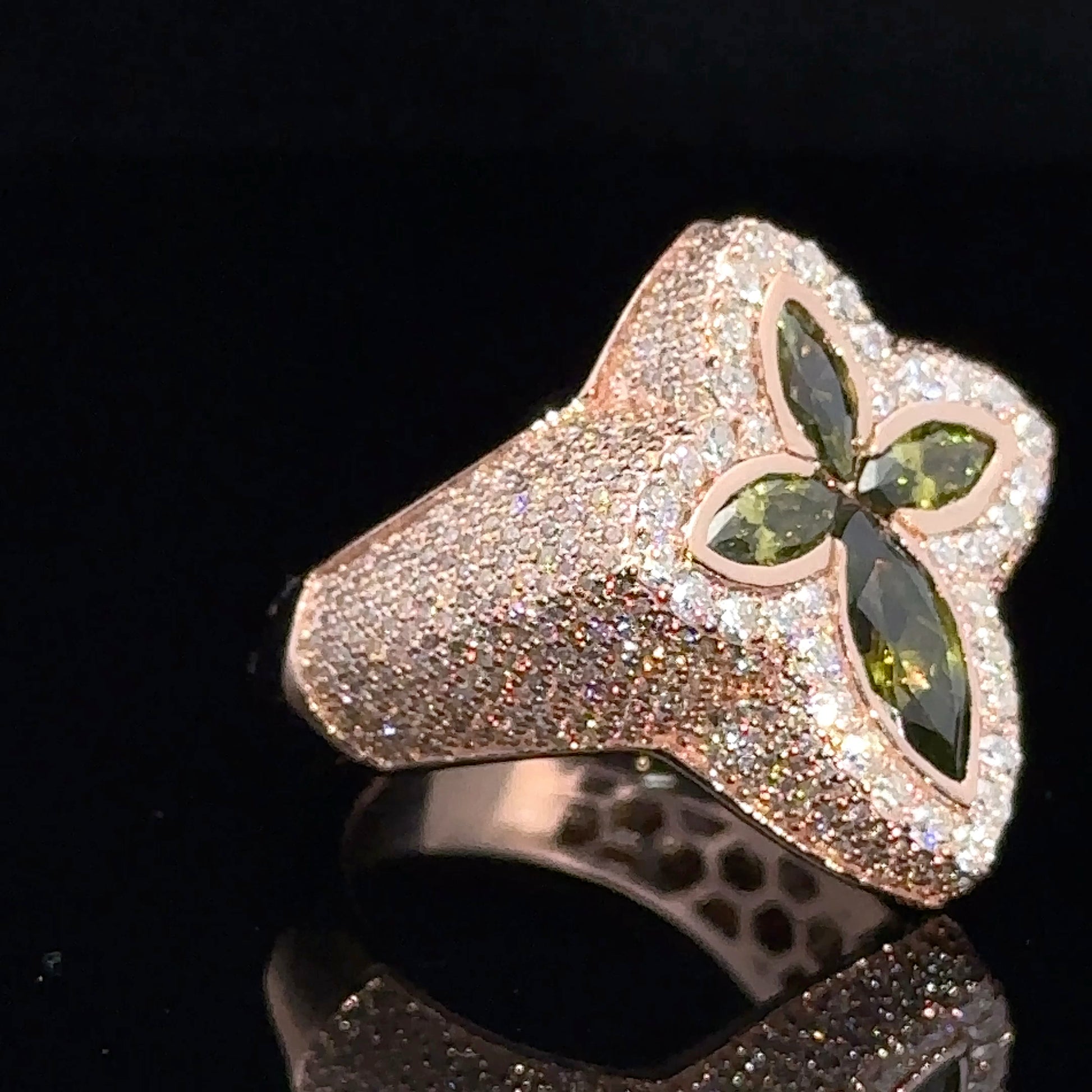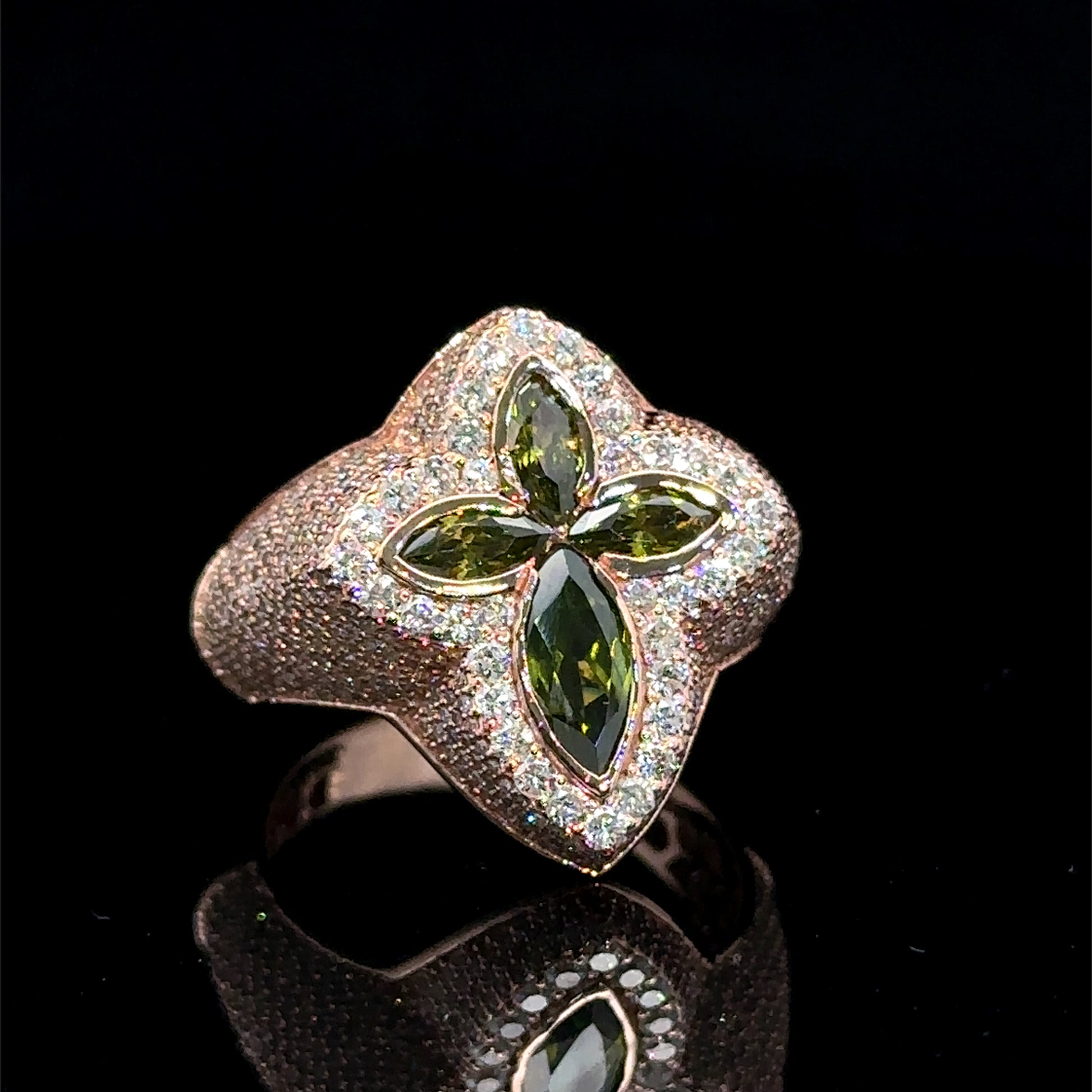 Rose gold and diamond Cross Ring with Green Fancy Pear Cut Gem Stones