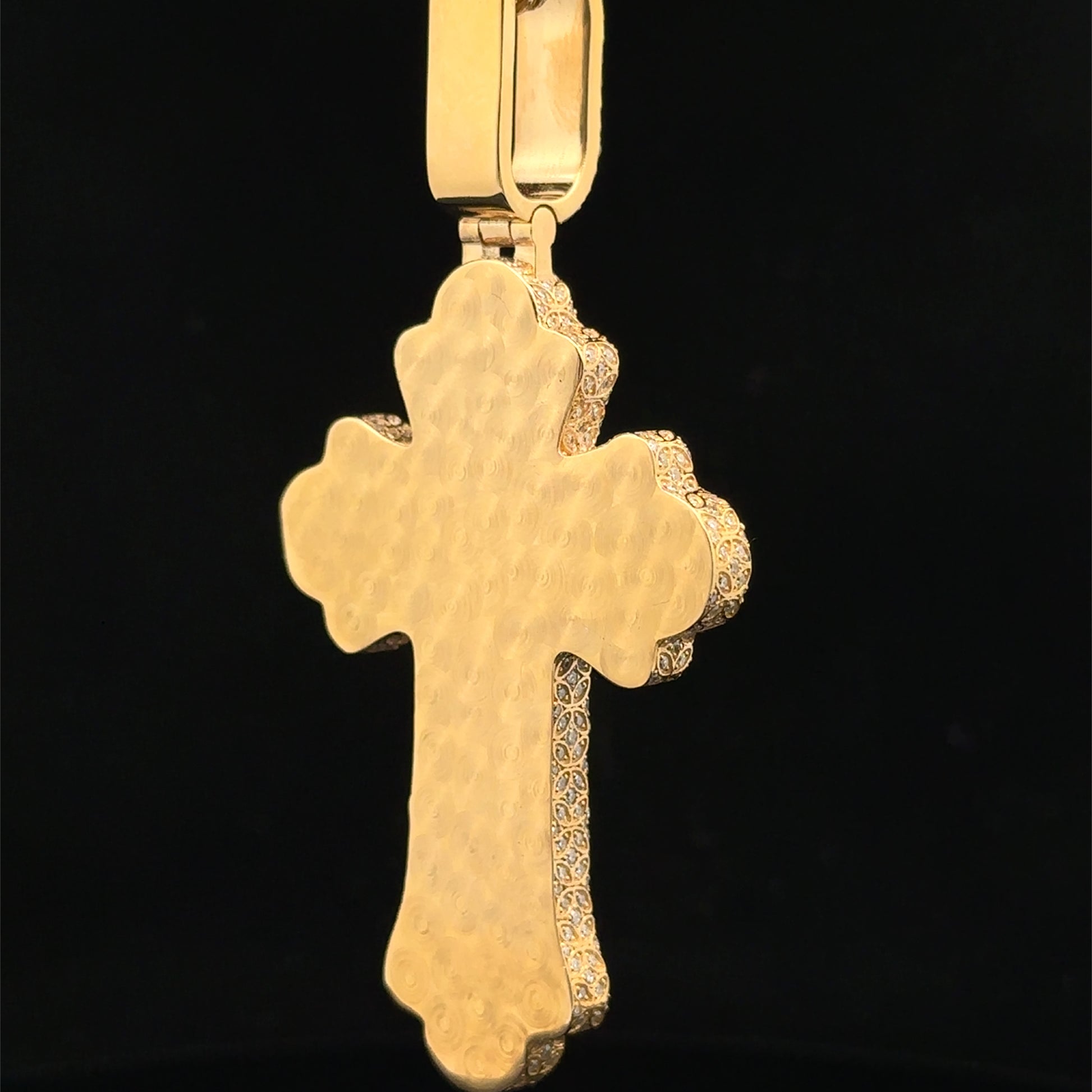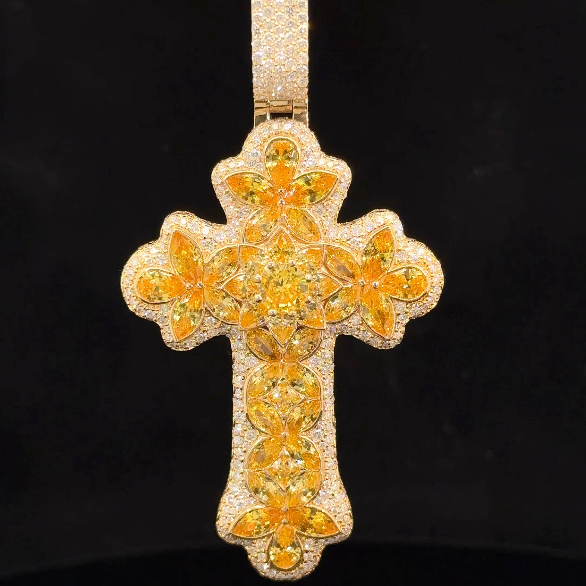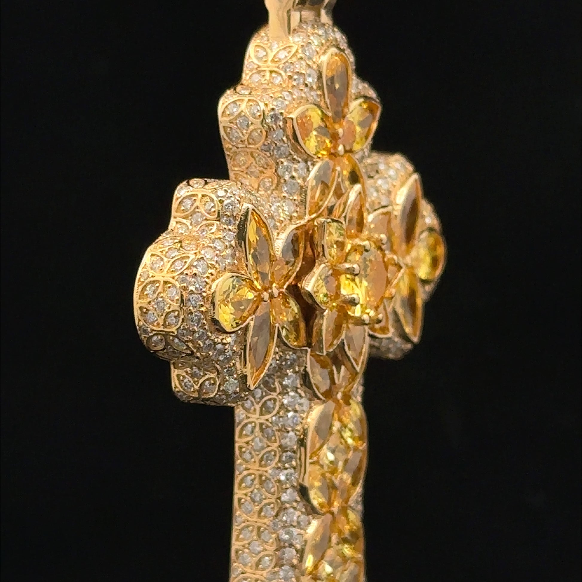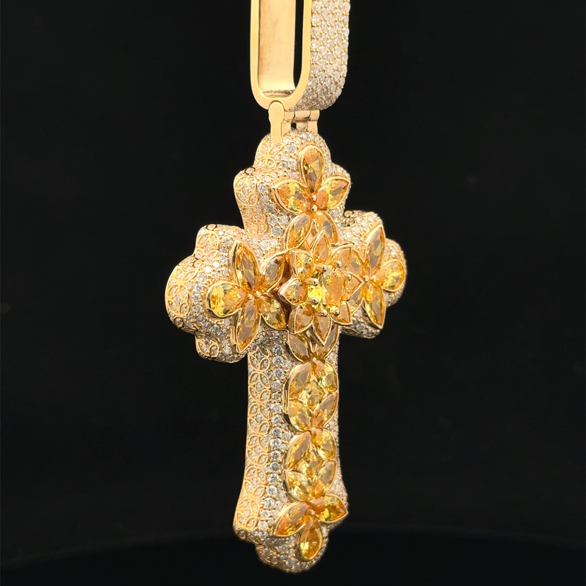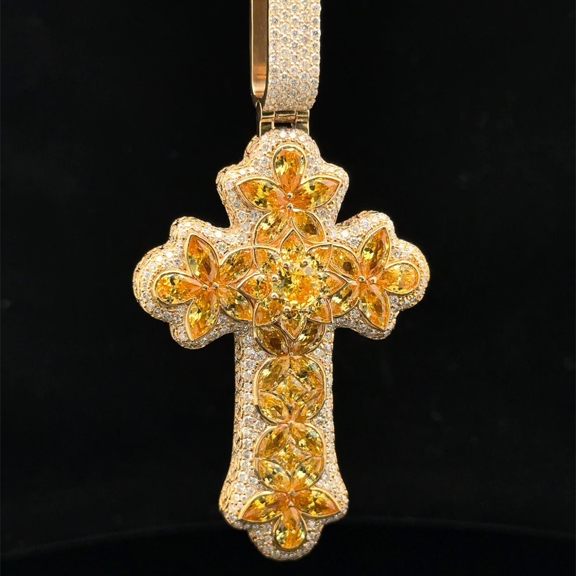 14k yellow gold and 5ct diamond Cross Pendant with round diamonds and yellow stones.